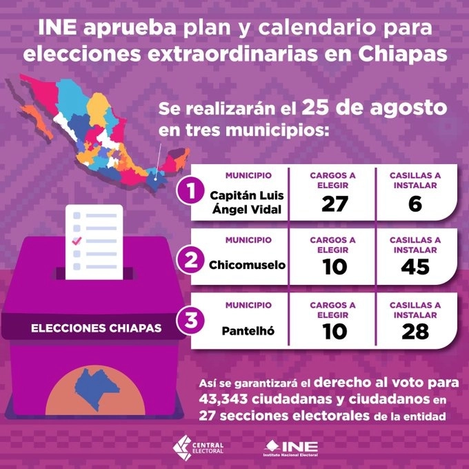 Chiapas, 19 de julio del 2024.- El Consejo General del Instituto Nacional Electoral (INE) aprobó el plan integral y el calendario para la elección extraordinaria para renovar los ayuntamientos en los municipios de Capitán Luis Ángel Vidal, Chicomuselo y Pantelhó, en Chiapas, que por el contexto de violencia no se logró llevar a cabo el 2 de junio pasado.