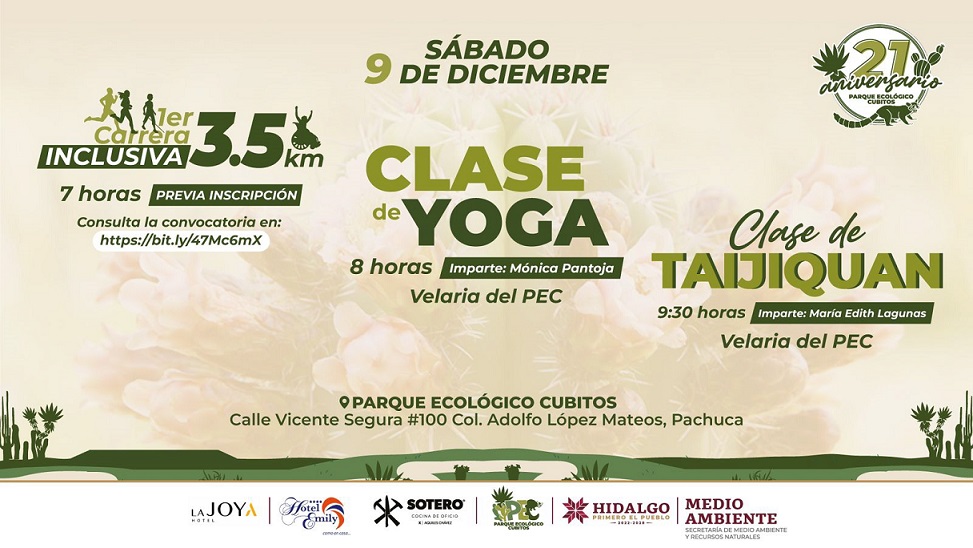 Desde las 8:00 horas, la instructora de yoga Mónica Pantoja, impartirá una clase en la velaria del recinto, ubicado en la calle Vicente Segura #100, colonia Adolfo López Mateos en Pachuca.