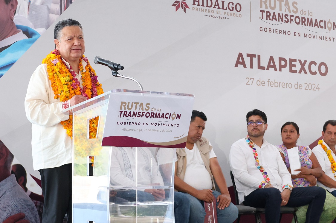 Atlapexco, Hgo., 27 de febrero de 2023.- En el marco de las Rutas de la Transformación-Gobierno en Movimiento en el municipio de Atlapexco, el titular del Ejecutivo en Hidalgo, Julio Menchaca Salazar, realizó la entrega de infraestructura, programas y estímulos económicos en beneficio de este municipio, y destacó que la administración que encabeza mantiene firme el compromiso de terminar con los rezagos a los que se enfrenta la población de esta región del estado.