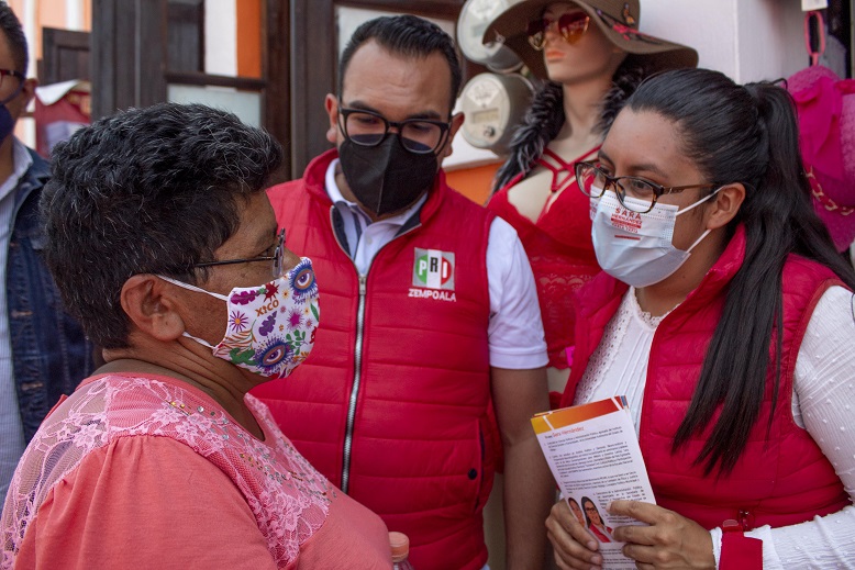 Sara Hernández, la candidata más joven de la coalición Va por Hidalgo a la diputación local del Distrito XVIII, junto a su compañera de fórmula Karla Tapia, visitó a comerciantes del tradicional tianguis de Zempoala y a comerciantes de la zona centro del municipio.