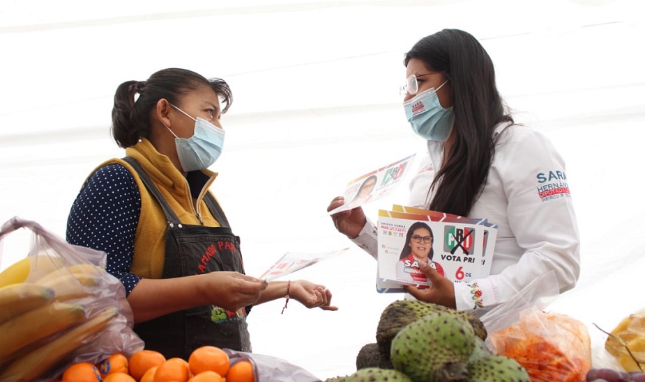 Sara Hernández y Karla Tapia, candidatas a la diputación local por el distrito XVIII Tepeapulco, visitaron a comerciantes del tradicional tianguis ubicado en la colonia IMSS, en Ciudad Sahagún.