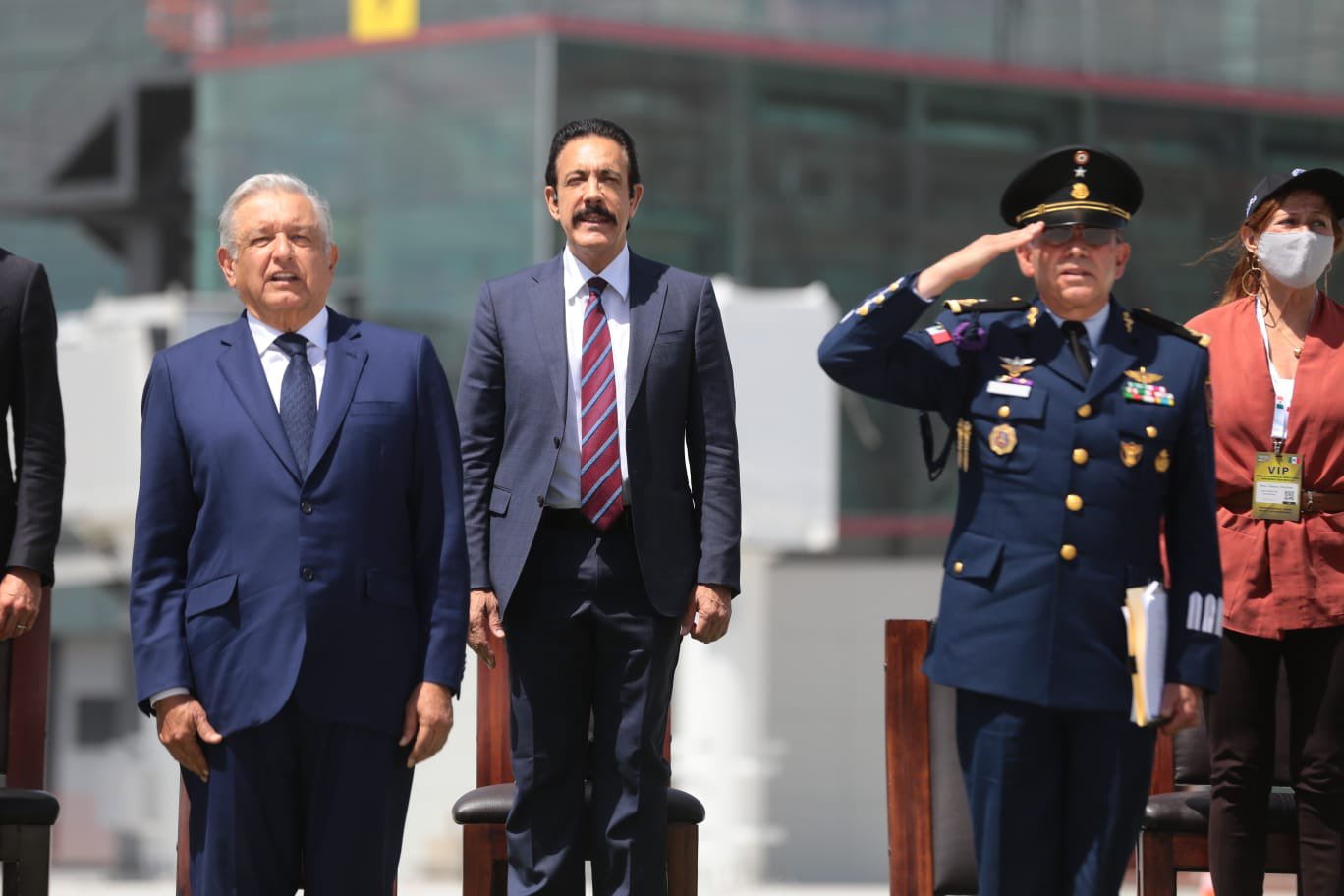 Zumpango, Estado de México; 22 de septiembre de 2021. El gobernador Omar Fayad acompañó al presidente de la República, Andrés Manuel López Obrador, a la inauguración de la Feria Aeroespacial México (FAMEX) 2021, en las instalaciones del Aeropuerto Internacional Felipe Ángeles; ésta se realizará del 22 al 25 de septiembre y ha sido denominado como el evento en su ramo, más importante de Latinoamérica.