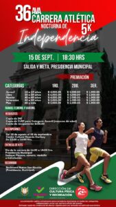 Sobre la Carrera Atlética Nocturna de Independencia, se informó que tendrá como salida y meta a la presidencia municipal y se realizará a las 18.30 horas; las inscripciones serán del 28 de agosto y hasta el 8 de septiembre en el Centro Cultural Ricardo Garibay con una cuota de recuperación de 200 pesos.