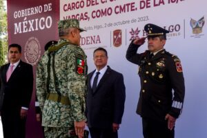 Pachuca de Soto, Hgo., 2 de octubre de 2023. El gobernador Julio Menchaca Salazar asistió a la toma de posesión del nuevo comandante de la 18/a Zona Militar, el general de Brigada Diplomado del Estado Mayor, Alfredo Salgado Vargas, quien durante este acto protocolario realizó la protesta de bandera correspondiente.