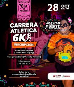 Por ello se tiene preparada una carrera atlética el próximo 28 de octubre en punto de las 18:30 horas teniendo como punto de partida la Plaza Constitución, la cual constara de un recorrido de 6 kilómetros teniendo participación de categoría libre para hombres y mujeres, quienes podrán realizar la carrera caracterizados de catrines y catrinas alusivo a las fechas a celebrar.