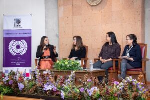 Posteriormente, como parte de la ceremonia de premiación del “Premio 17 de Octubre”, se llevó a cabo un espacio de reflexiones de los Ensayos recibidos en esta edición, espacio que estuvo a cargo de las integrantes del Jurado Calificador integrado por la Dra. Josefina Hernández Téllez, especialista en Estudios de la Mujer y Coordinadora del Grupo de Investigación Género y Comunicación en la Asociación Mexicana de Investigadores de la Comunicación; así como de la Dra. Leyla Chávez Arteaga y de la Dra. Rosa Elena Durán González, ambas investigadoras de la Universidad Autónoma del Estado de Hidalgo (UAEH).