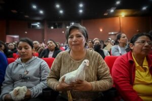 Ahí resaltó el papel tan importante que juega la mujer en el campo y explicó que cada apoyo consta de 14 gallinas ponedoras y un gallo.