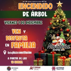 Actopan, Hidalgo, 01 de diciembre del 2023.- Para celebrar las fiestas decembrinas, el Gobierno Municipal de Actopan llevará a cabo el gran encendido del árbol navideño así como diferentes actividades artísticas y musicales el 1 de diciembre del 2023 en punto de las 18:00 horas, en la Plaza Constitución.