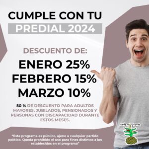 Actopan, Hidalgo, 08 de enero del 2024. – El Gobierno Municipal de Actopan a través de la Dirección de Catastro e Impuesto predial tendrá descuentos a los usuarios que acudan a pagar de manera puntual su Impuesto Predial durante el año 2024: enero 25%, febrero 15% y marzo 10% de descuento, además de un 50% de descuentos adultos de la tercera edad con o sin tarjeta de pensionado durante el primer trimestre del año.