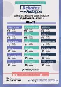 Pachuca de Soto, Hgo., 26 de marzo de 2024.- En Conferencia de Prensa, el Instituto Estatal Electoral de Hidalgo (IEEH) dio a conocer las fechas, horarios y sedes en que se llevarán a cabo los Debates del Proceso Electoral 2023 – 2024, tanto para la renovación de las 30 Diputaciones Locales como de los 84 Ayuntamientos.