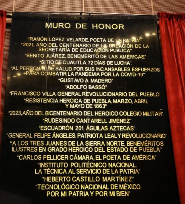 La Secretaría de Educación Pública (SEP) y el Senado de la República develaron la inscripción: “Tecnológico Nacional de México, por mi patria y por mi bien”, en el Muro de Honor de ese órgano legislativo, en reconocimiento al trabajo de esa institución de Educación Superior en la formación integral de ingenieras e ingenieros a favor del desarrollo de la nación.