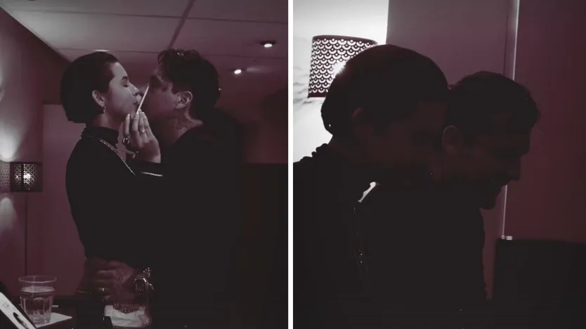 En la imagen se puede ver a Ángela dándole un beso a Nodal, quien a su vez toma de la pierna a la hija de Pepe Aguilar, que pese a lo borroso de la foto, se puede ver la pasión que hay entre ambos cantantes. Asimismo, para acompañar la imagen en blanco y negro, el intérprete de «Adiós Amor», escribió:
