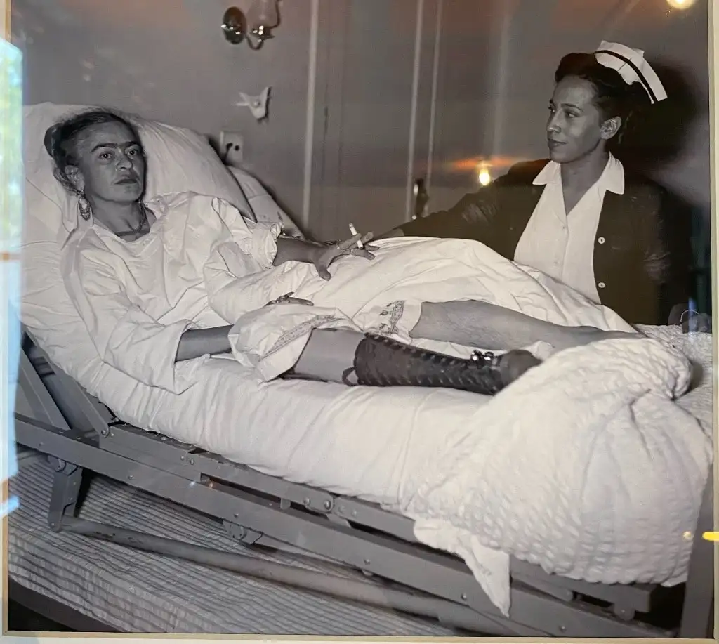 En una de las impresiones en blanco y negro se puede observar a Frida sobre la cama, “deteriorada, demacrada, sin moños en la cabeza, canosa”, y fumando dentro de la habitación, con la pierna derecha amputada debajo de la rodilla, procedimiento realizado en agosto de 1953. La pintora murió menos de un año después, el 13 de julio de 1954, a los 47 años.