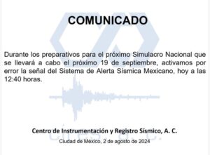 Durante los preparativos para el próximo Simulacro Nacional que se llevará a cabo el próximo 19 de septiembre, activamos por error la señal del Sistema de Alerta Sísmica Mexicano, hoy a las 12:40 horas”, detalló el Centro.