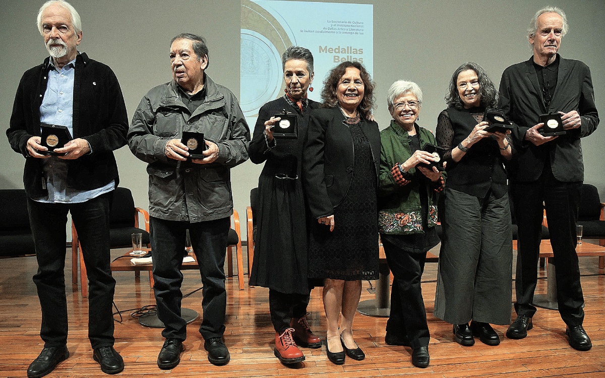 Ciudad de México, 07 de agosto del 2024.- Este martes, en la Sala Manuel M. Ponce, los aplausos no cesaron para reconocer a dos fotógrafas, un muralista, una pintora contracorriente y dos artistas multidisciplinarios, ganadores del máximo reconocimiento del arte en el país correspondiente a los años 2023 y 2024. Este martes, en la Sala Manuel M. Ponce del Palacio de Bellas Artes se concretó la segunda jornada de premiación de las Medallas Bellas Artes correspondientes a los años 2023 y 2024, en esta ocasión para la disciplina de Artes Visuales. Fueron seis reconocimientos los entregados en la ocasión, dos correspondientes al año precedente, para la fotógrafa Lourdes Almeida y para el muralista Guillermo Ceniceros, y cuatro correspondientes al año en curso, para la también fotógrafa Yolanda Andrade y para la pintora Magali Lara, así como para los creadores multidisciplinarios Jan Hendrix y Carlos Aguirre.