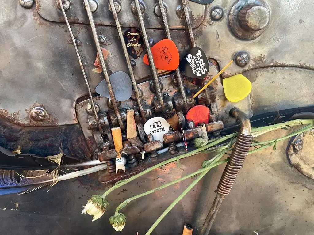 El monumento consta de una cúpula de piedra de más de 12 metros de altura, sostenida por un trío de columnas. Dentro, hay un retrato grabado de Hendrix que hoy está lleno de marcas de besos, en todos los tonos de rojo. No faltan las ofrendas ad hoc: bachitas de mota y tabaco, uñas para guitarra, centavos, cuarzos, plumas de aves, flores blancas y pequeñas piedras traídas por sus admiradores, que con un profundo respeto permanecen varios minutos frente a la tumba, escuchando desde sus teléfonos las rolas de Jimi.