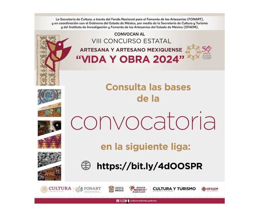 Estado de México, 27 de agosto del 2024.- Con el fin de fortalecer y salvaguardar las técnicas y los procesos artesanales, el Gobierno del Estado de México encabezado por la Maestra Delfina Gómez Álvarez convoca a participar en el VIII Concurso Estatal Artesana y Artesano Mexiquense “Vida y Obra 2024,” que cuenta con una bolsa a repartir de un millón 421 mil pesos distribuidos en 74 premios.