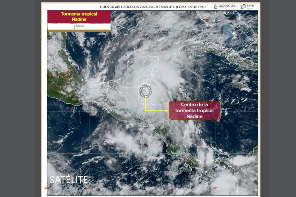 Ciudad de México, 19 de octubre del 2024.-El Servicio Meteorológico Nacional (SMN) dio a conocer que, en punto de las 10:00 horas, el centro de la Tormenta Tropical ‘Nadine’ tocó tierra en inmediaciones de la Ciudad de Belice, Belice, aproximadamente a 90 kilómetros al sur de Chetumal, en el estado de Quintana Roo.