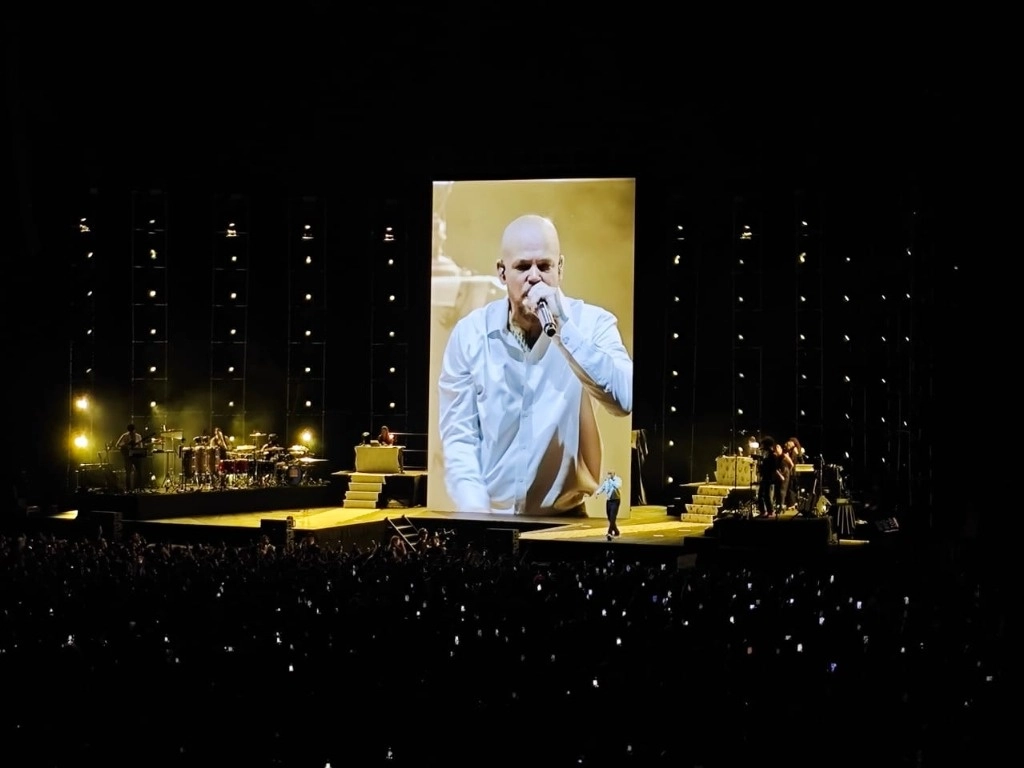 La vuelta al mundo, melodía más sentimental a la que el respetable hizo segunda voz, mientras que en la pantalla aparecía la creación de otra pintura relacionada con la pieza interpretada. Por el fin de las guerras Tras este bloque, el boricua clamó por el fin de los conflictos armados en el mundo, haciendo énfasis en la invasión israelí en la Franja de Gaza, la guerra en Ucrania y los conflictos en Myanmar y diversos países de África, saliendo a relucir entre el público las banderas palestinas, de Puerto Rico y México para pasar entonces a interpretar Guerra, con la que dió la tónica para su siguiente bloque de canciones, al reivindicar la identidad de América Latina con This Is Not America, cuyas poderosas percusiones hicieron cimbrar al recinto y después, precedida de un arreglo de guitarra bastante virtuoso, dar paso a Latinoamérica, sin duda, la canción más política y poética de su repertorio, que los asistentes cantaron a todos pulmón, incluso la parte interpretada en portugués. Un nuevo bloque musical comenzó con Ojos color sol, compuesta con Silvio Rodríguez, donde el puertorriqueño volvió a la senda de las baladas y el amor, en un tema en el cual su corista y acompañante en su travesía musical, Kiany Medina, tuvo un destacado desempeño, al hacer suyas las estrofas que en la versión de estudio son cantadas por el trovador cubano.