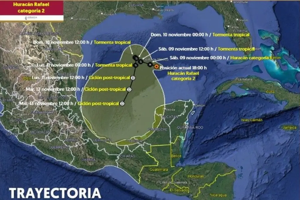 Ciudad de México, 09 de noviembre del 2024.- El Servicio Meteorológico Nacional (SMN) informó que el huracán Rafael continúa como categoría 2, y se localiza a 340 kilómetros del Río Lagartos y a 365 kilómetros de Progreso en el estado de Yucatán. Según el informe detalla que el sistema ciclónico provocará fuertes lluvias en Campeche, Quintana Roo y Yucatán, además se prevén rachas de viento de entre 40 y 60 km/h, así como oleaje elevado de 1.5 a 2.5 metros.
