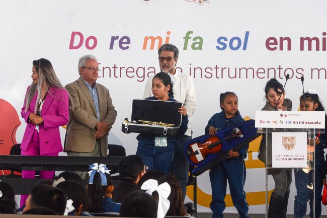 En presencia de la jefa de Gobierno de la Ciudad de México, Clara Brugada Molina, el titular de la AEFCM sostuvo que la música abre el espíritu; permite dimensionar la vida, las matemáticas y, al mismo tiempo, genera felicidad, por lo que reconoció el interés de la autoridad local por incorporar esta iniciativa en los planteles escolares a partir de este ciclo escolar. “El compromiso no solamente tiene que ver con los instrumentos, sino tenemos que contar con maestras y maestros. Padres y madres de familia, tutores y tutoras tenemos que incorporarnos todos a esta gran tarea de sensibilizarnos, de humanizarnos aquí, en este oasis, que es esta maravillosa escuela”, agregó. Durante el acto, el titular de la AEFCM y la jefa de Gobierno de la Ciudad de México, entregaron 76 instrumentos musicales como parte del programa “Do, re, mi, fa, sol en mi escuela” a las y los alumnos de la primaria Gabino Barreda de la alcaldía Cuauhtémoc.