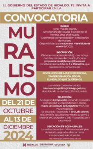 Velázquez Mendoza exhortó a las y los interesados a enviar sus bocetos tipo mural, considerando medidas de 5 por 25 metros a [email protected]. Las bases pueden ser consultadas en https://intervenciongrafica.hidalgo.gob.mx/