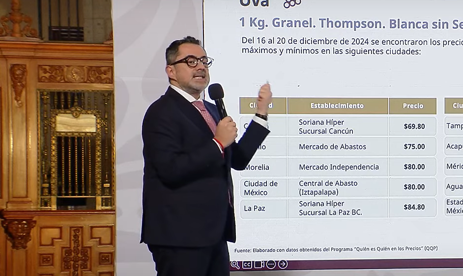 Ciudad de México, 30 de diciembre del 2024.- Hoy en conferencia de prensa Iván Escalante, procurador federal del consumidor, informó que el precio promedio por el kilogramo de la uva blanca fue de 113.70 pesos, aunque hizo una recomendación de adquirirla en mercados o centrales de abasto por su precio más barato que en supermercados.