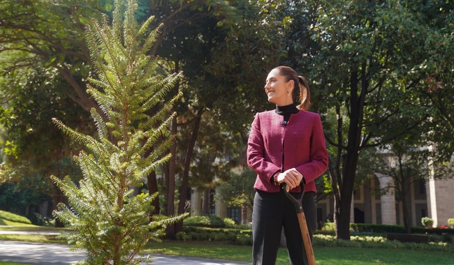 La Jefa del Ejecutivo Federal cerró el 2024 sembrando en el Jardín Nezahualcóyotl de Palacio Nacional un árbol Abiesreligiosa, una conífera nativa de los bosques del centro y sur del país.