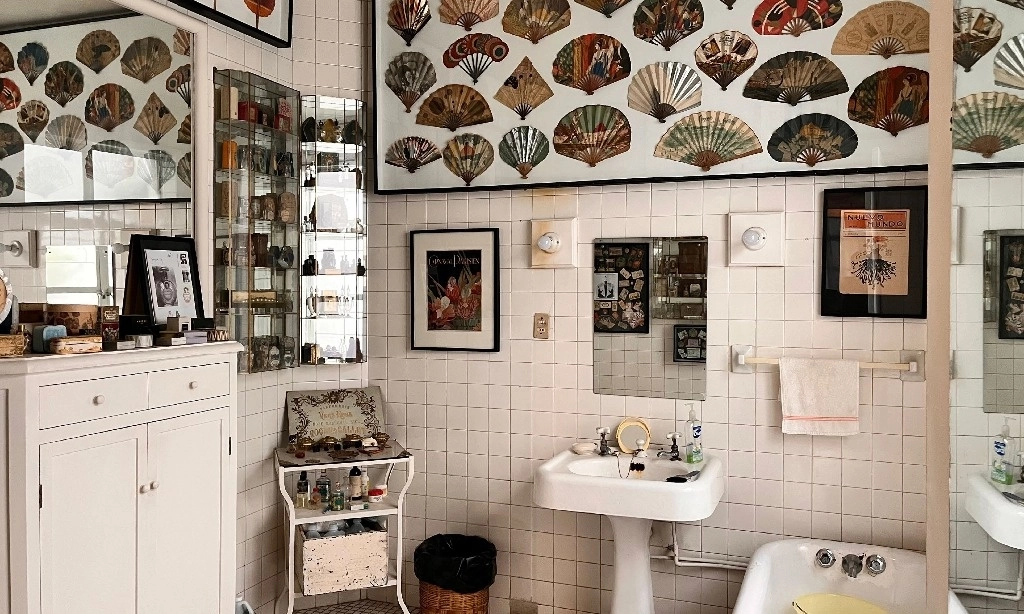 Argüelles consideró superatinado haber escogido como portada del catálogo una imagen del baño de Alan, uno de los lugares más increíbles de la casa, con su colección enorme de abanicos y vitrinas con cajitas de todos lados.