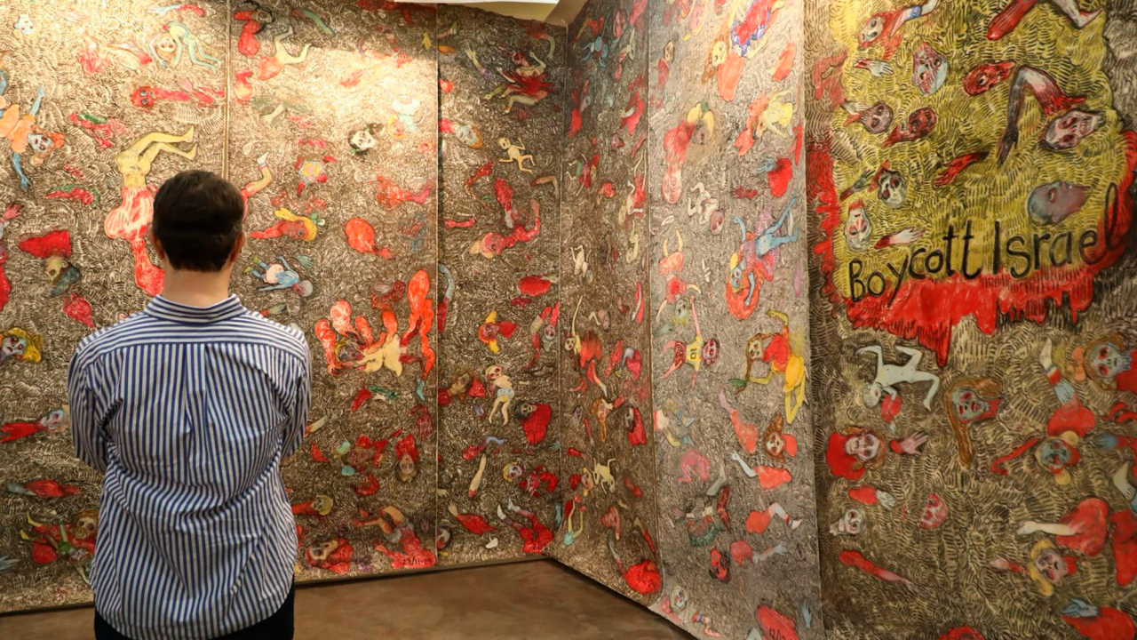 Este políptico lleva por nombre “Lost Humanity. One way ticket to mars”, y el panel que más llamó la atención fue aquel donde Vanessa Baird colocó el siguiente mensaje: “End the occupation. Boycott Israel”.