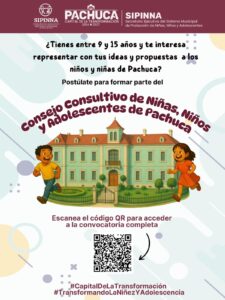 Pachuca de Soto, Hgo., 16 de mayo de 2025.- Con el firme compromiso de garantizar espacios de participación activa para la niñez y adolescencia, el Ayuntamiento de Pachuca, a través de la Secretaría Ejecutiva del SIPINNA, convoca a pachuqueñas y pachuqueños de entre 9 y 15 años a formar parte del Consejo Consultivo de Niñas, Niños y Adolescentes.