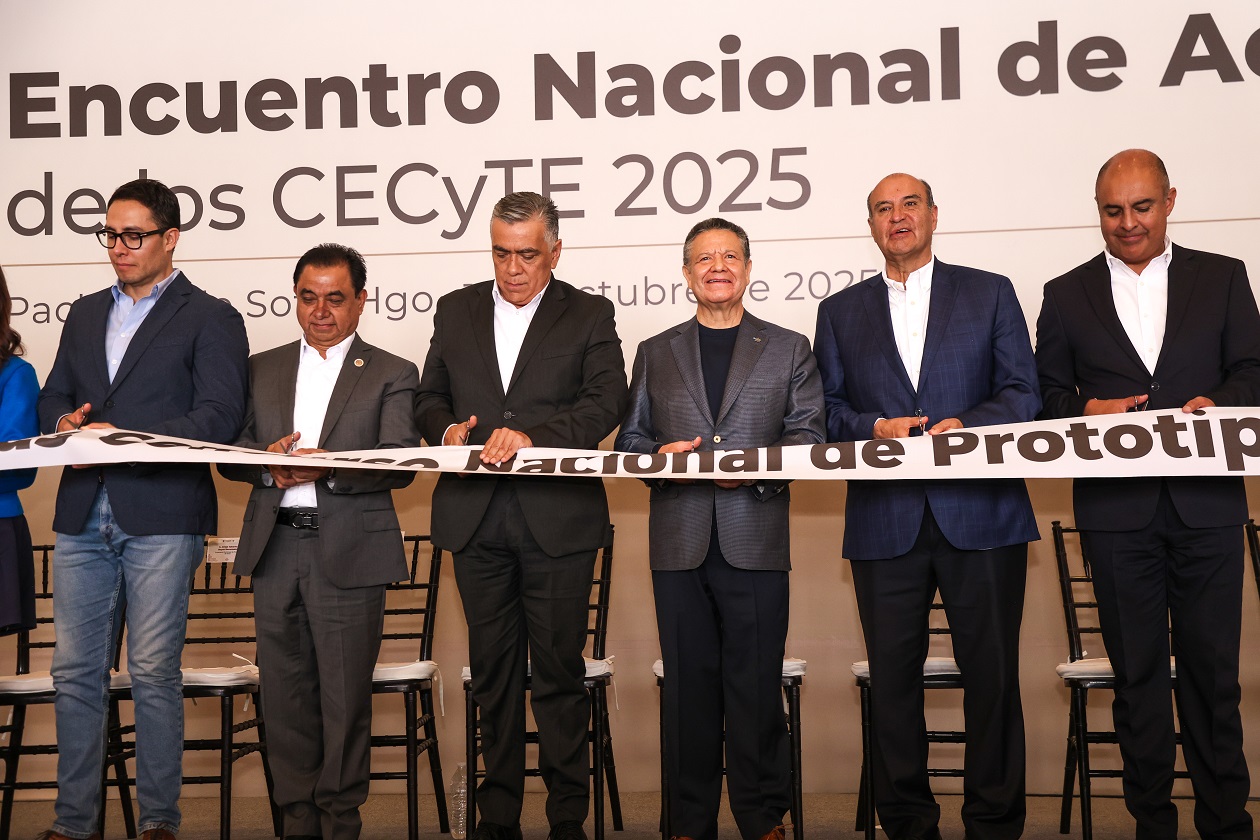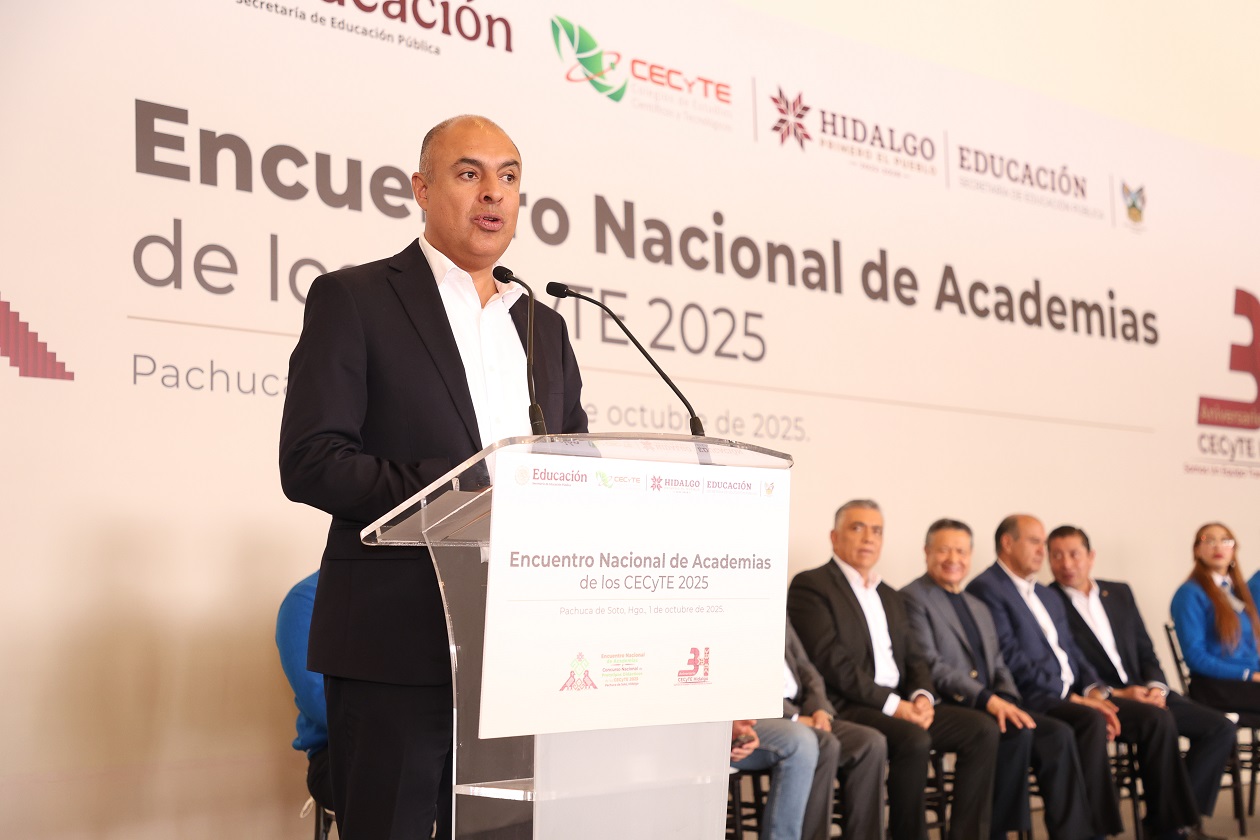Pachuca de Soto, Hgo., 1 de octubre de 2025. En el marco del 34 aniversario del Colegio de Estudios Científicos y Tecnológicos del Estado de Hidalgo (CECyTEH), el gobernador Julio Menchaca Salazar encabezó la inauguración del Encuentro Nacional de Academias de los CECyTE 2025, un espacio para impulsar el trabajo educativo en favor de más de un millón de estudiantes que pertenecen a este subsistema en todo el país.
