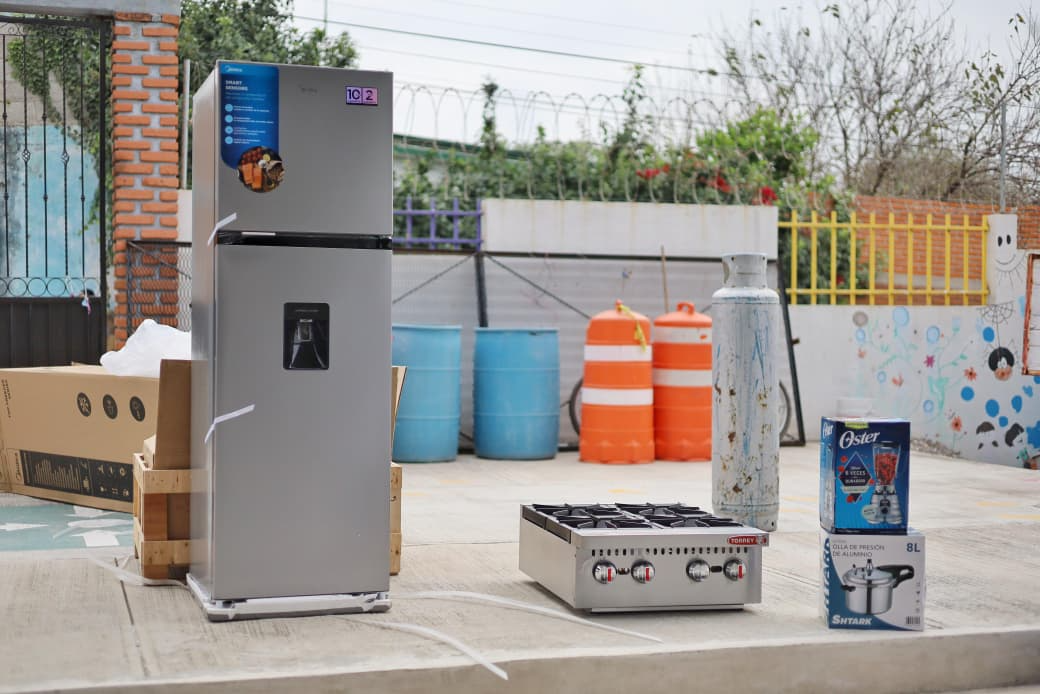 En el Preescolar 21 de Abril, ubicado en Melchor Ocampo “El Salto”, se entregó equipamiento para el comedor escolar —refrigerador, parrilla, licuadora, tanque de gas y olla exprés— con el objetivo de fortalecer el programa de Desayunos Escolares en su modalidad caliente, que brinda alimentación nutritiva y de calidad a la comunidad estudiantil.