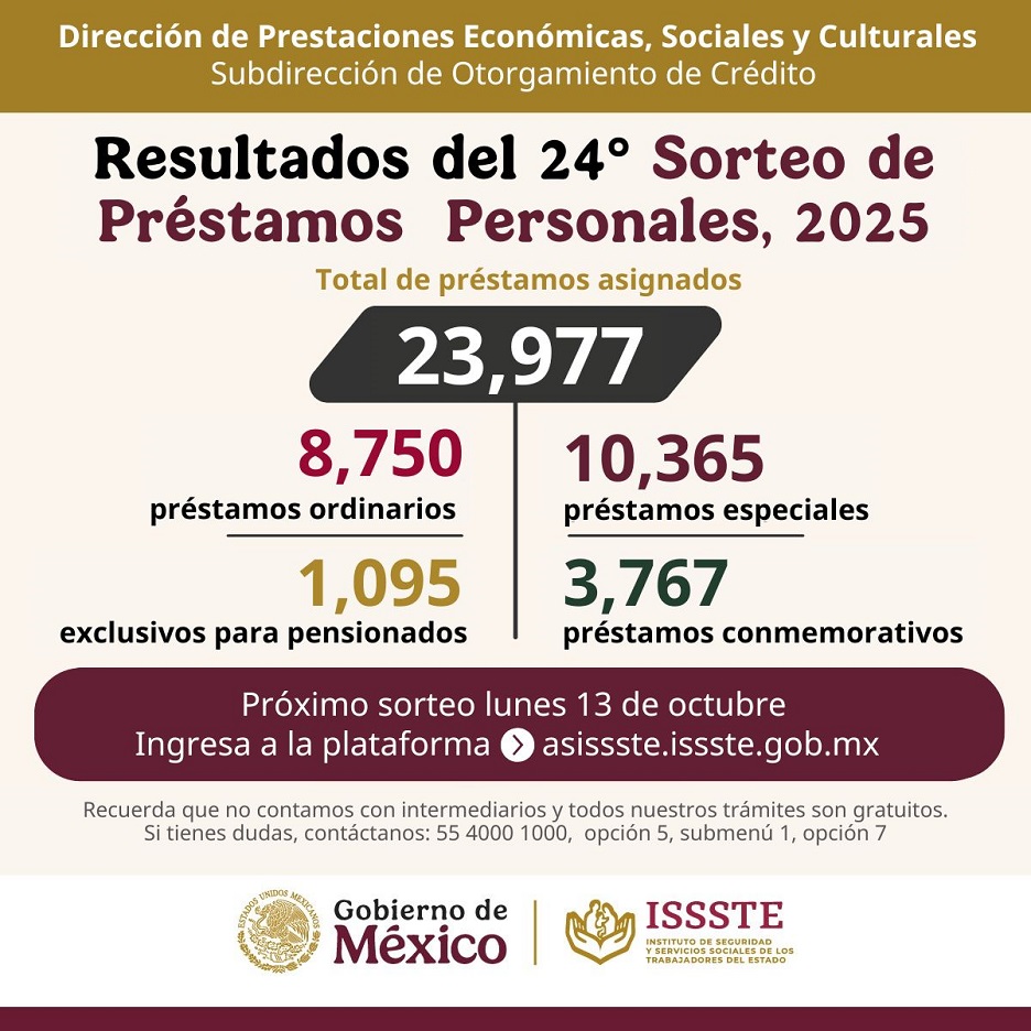 Ciudad de México, a 3 de octubre de 2025.- El Instituto de Seguridad y Servicios Sociales de los Trabajadores del Estado (ISSSTE), encabezado por el director general Martí Batres Guadarrama, informa que en el vigésimo cuarto sorteo convencional del Programa Anual de Préstamos Personales 2025 se asignaron 23 mil 977 créditos, salieron todos aquellos que cumplieron los requisitos.