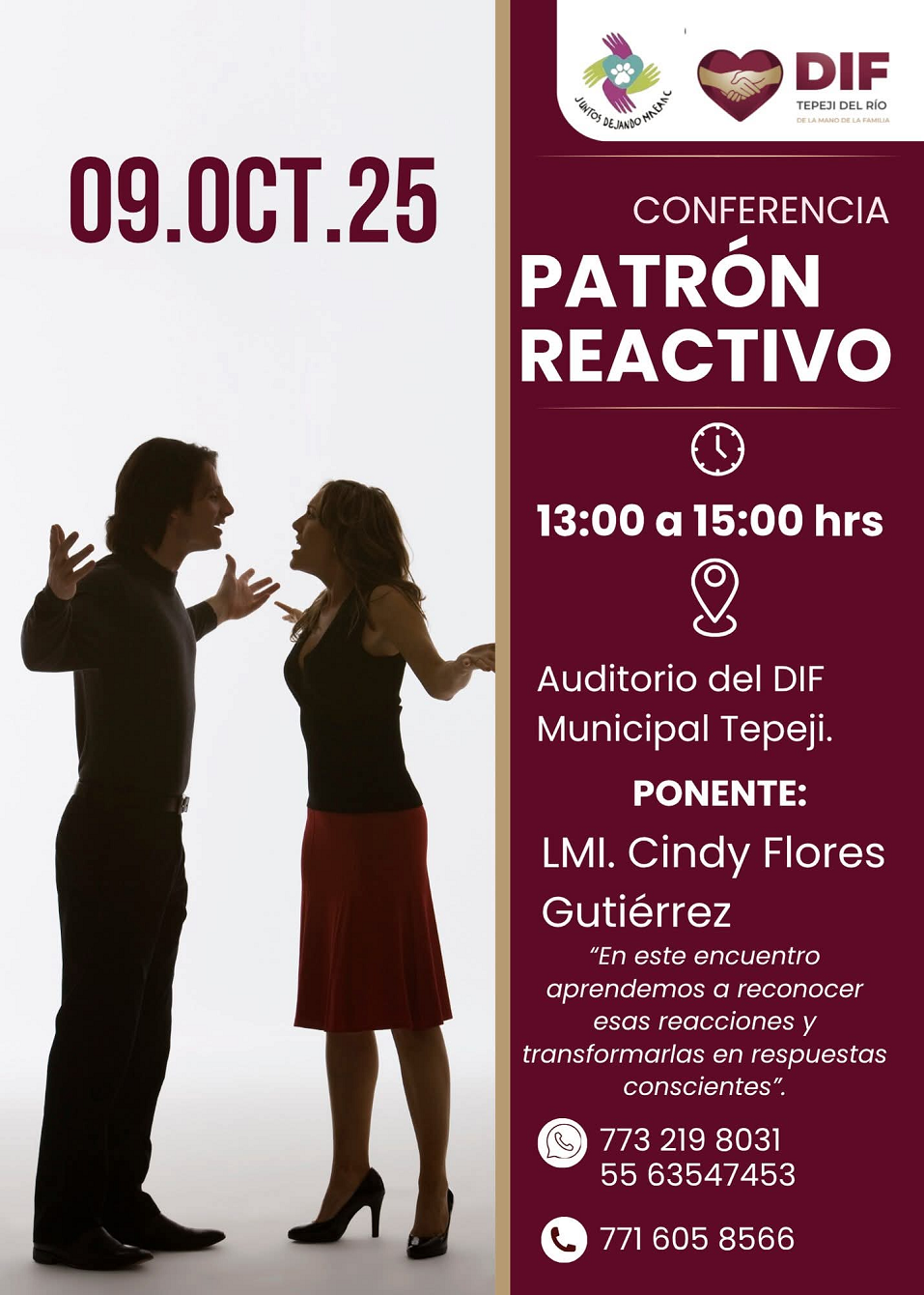 Tepeji del Río de Ocampo, Hgo., 03 de octubre del 2025.- El Gobierno Municipal de Tepeji del Río de Ocampo, que encabeza la alcaldesa Tania Valdez Cuellar, a través del Sistema DIF Municipal, invita a la ciudadanía a participar en la conferencia “Patrón Reactivo”, una iniciativa que busca ofrecer herramientas para el crecimiento personal, el reconocimiento de emociones y la transformación de experiencias de vida.