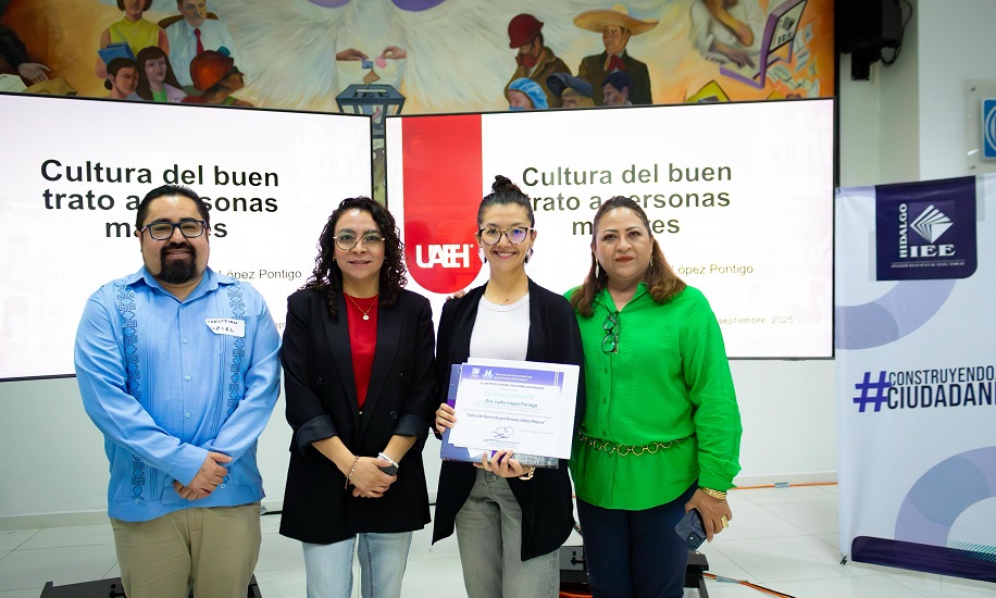 Pachuca de Soto, Hgo., 09 de octubre de 2025.- Como parte del compromiso con la promoción de los derechos humanos y la inclusión social de la ciudadanía hidalguense en actividades de la vida pública, el Instituto Estatal Electoral de Hidalgo (IEEH), diseñó un programa de capacitación y sensibilización dirigido a su personal integrado por una conferencia y cinco talleres, con el propósito de fomentar una cultura de respeto, empatía y reconocimiento hacia las personas adultas mayores.
