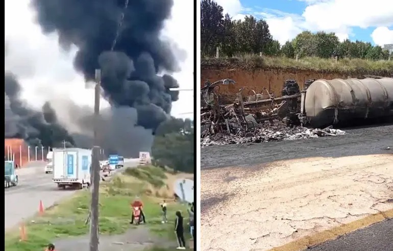 Ciudad de México, 11 de octubre del 2025.- Una pipa de gas explotó esta mañana en el kilómetro 72 de la autopista México-Puebla, cerca del pueblo de Santa Rita Tlahuapan, en Puebla. El fuerte estallido provocó un gran incendio y una columna de humo que se veía desde varios kilómetros.