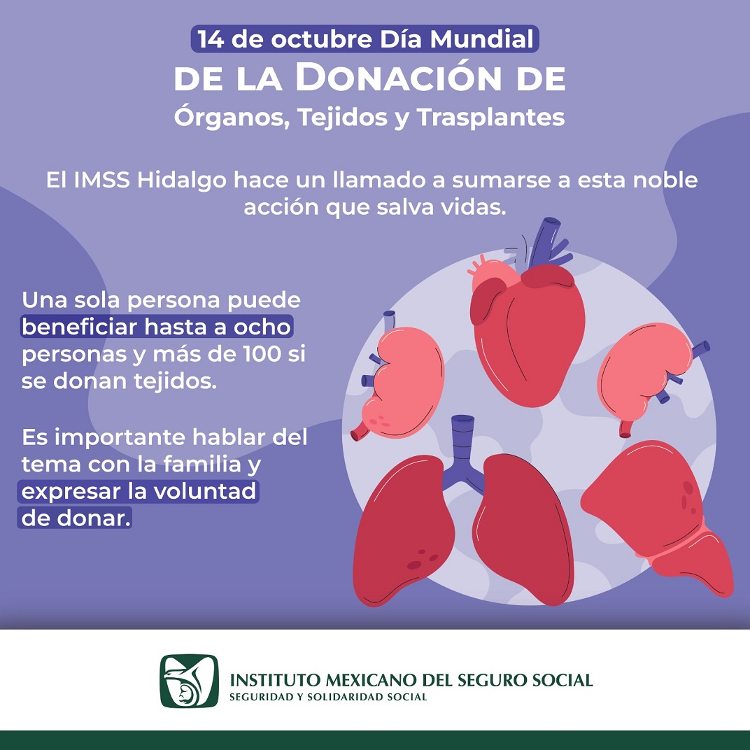 Pachuca, Hidalgo, 13 de octubre de 2025.- En el marco del Día Mundial de la Donación de Órganos, Tejidos y Trasplantes, 14 de octubre, el Instituto Mexicano del Seguro Social (IMSS) en Hidalgo hace un llamado a la población a sumarse a esta noble acción que puede salvar o mejorar la calidad de vida de miles de personas en espera de un trasplante.