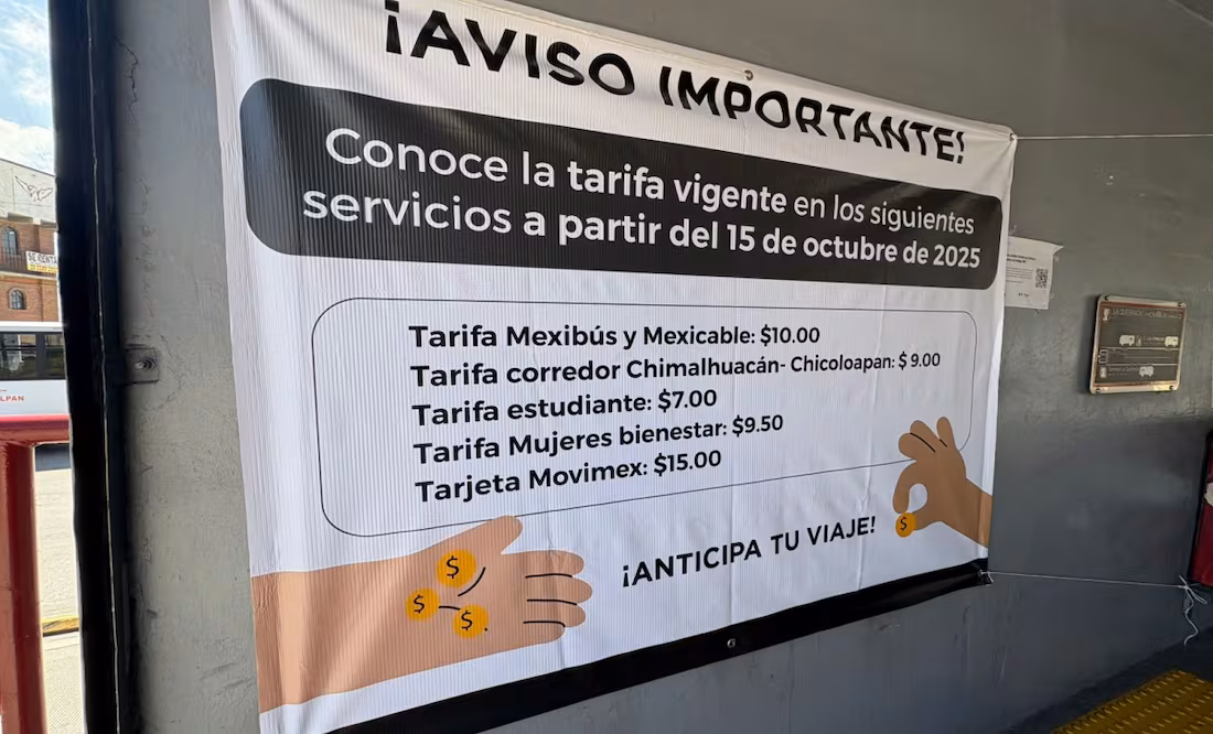 “Conoce la tarifa vigente en los siguientes servicios a partir del 15 de octubre del 2025. Tarifa Mexibús y Mexicable: 10 pesos. Tarifa Corredor Chimalhuacán-Chicoloapan: 9 pesos. Tarifa estudiante: 7 pesos. Tarifa Mujeres Bienestar: 9.50 pesos. Tarifa Movimex: 15 pesos”, señala la lona informativa.
