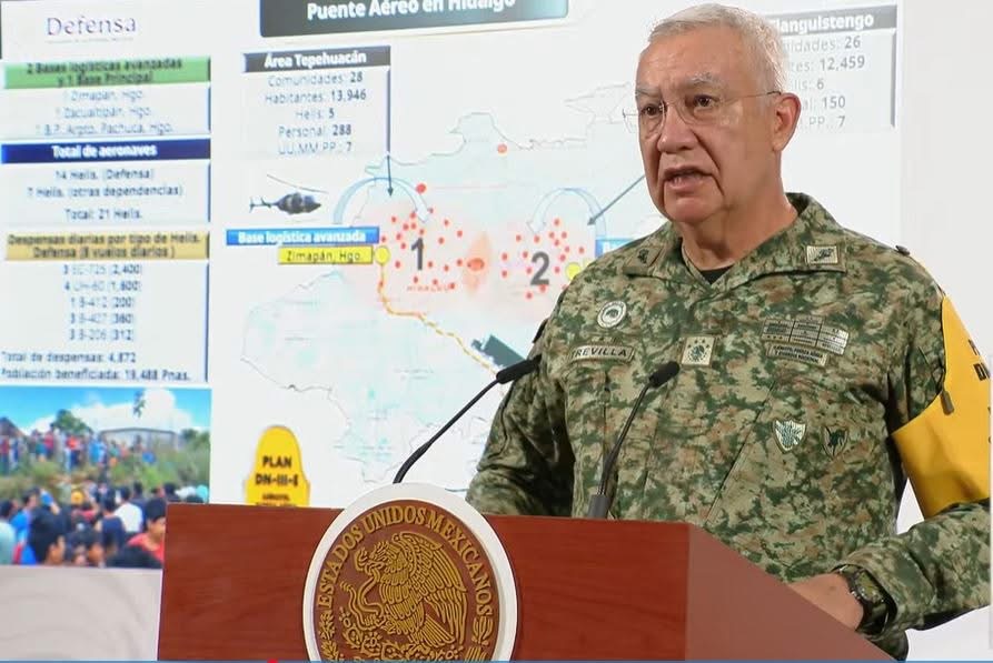 El secretario de la Defensa Nacional, general Ricardo Trevilla Trejo, informó que por instrucciones de la Jefa del Ejecutivo Federal se trasladó a Hidalgo para supervisar la instalación de los tres Centros de Mando: una Base Principal que cuenta con 10 helicópteros en apoyo a 57 comunidades y dos Bases Logísticas Avanzadas, la ubicada en Zimapán cuenta con cinco helicópteros para abastecer a 28 comunidades, mientras que la base en Zacualtipán, dispone de seis helicópteros para 26 comunidades.