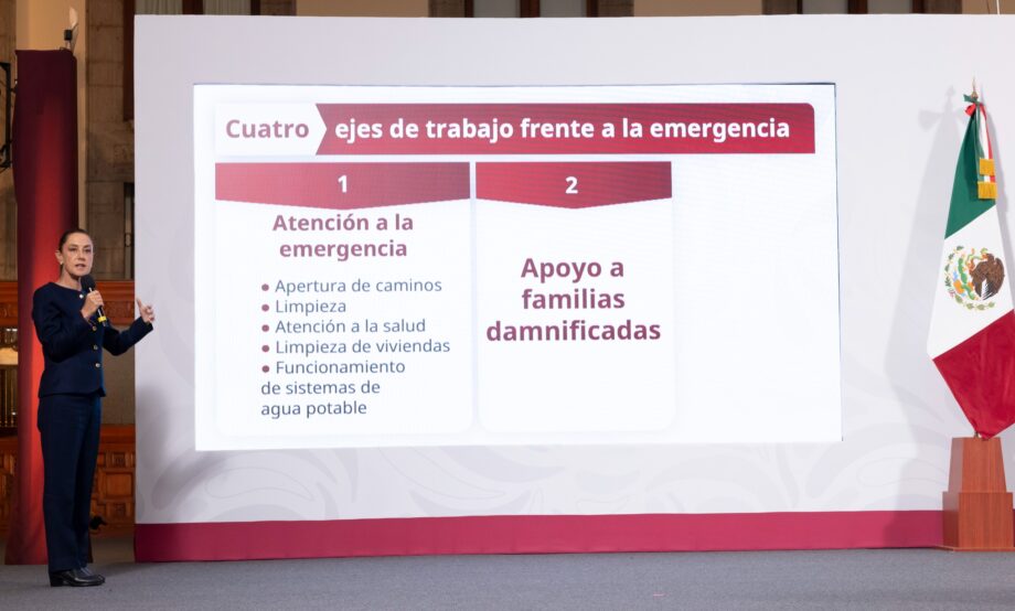 Ciudad de México, 20 de octubre de 2025.- Son cuatro ejes los que se trabajan para la atención en la emergencia por las recientes inundaciones en Hidalgo, Puebla, Querétaro, San Luis Potosí y Veracruz, que han dejado más de 70 personas fallecidas y 75 desaparecidas, informó la presidenta Claudia Sheinbaum Pardo.