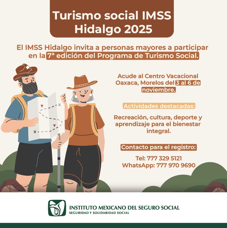 Pachuca, Hidalgo, 29 de octubre de 2025.- El Instituto Mexicano del Seguro Social (IMSS) en Hidalgo, a través de la Oficina de Bienestar Social y Atención a Pensionados, invita a personas mayores a participar en la séptima edición del Programa de Turismo Social, que se llevará a cabo del 3 al 6 de noviembre de 2025 en el Centro Vacacional Oaxtepec, Morelos, bajo la temática “Diversión Vaquera”.