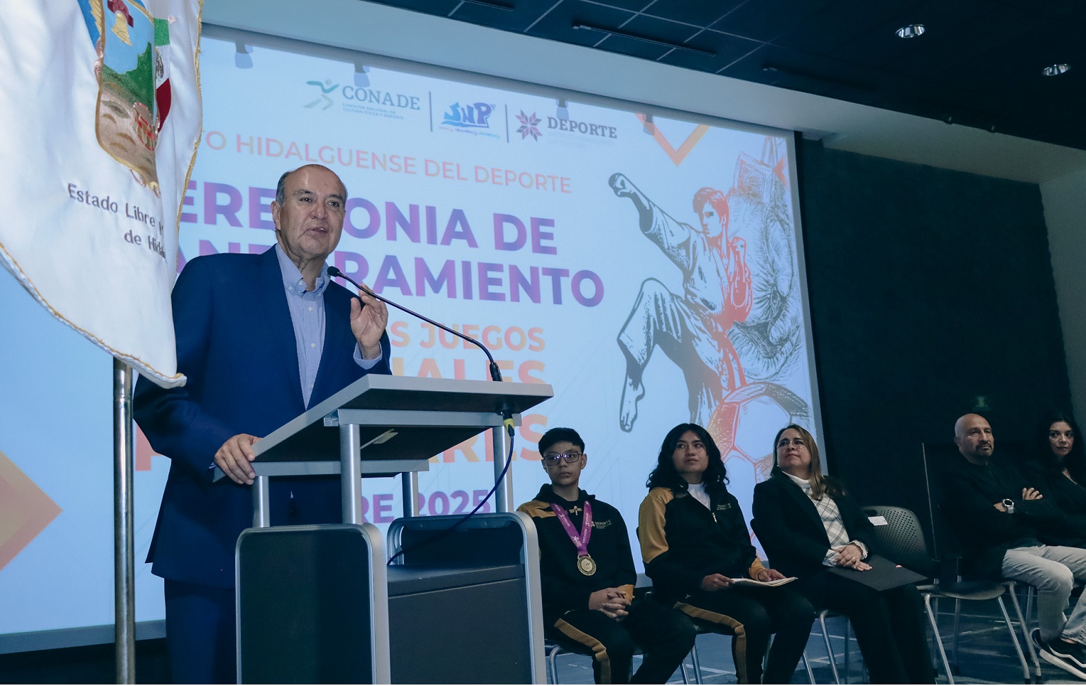 Pachuca de Soto, Hgo., 29 de octubre de 2025.- El secretario de Educación Pública de Hidalgo, Natividad Castrejón Valdez, encabezó el Abanderamiento de la Delegación Hidalguense rumbo a los Juegos Nacionales Populares 2025, en donde participarán 87 atletas en diferentes disciplinas del 2 al 11 de noviembre en Oaxtepec, Morelos.