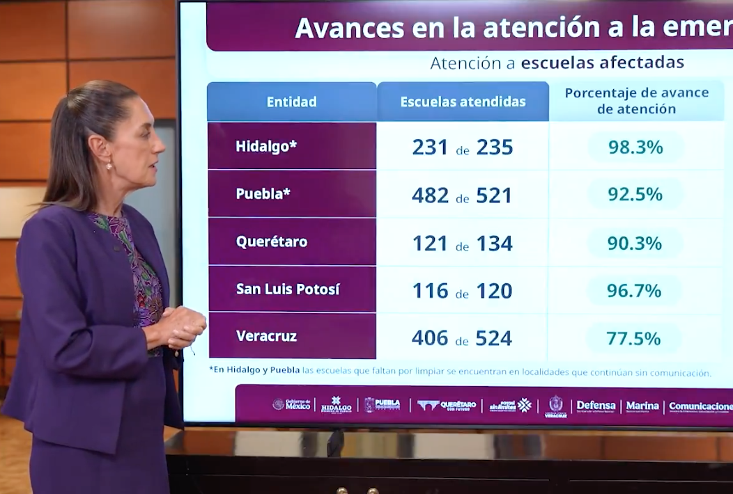 Puntualizó que desde la semana pasada la CFE restableció el 100 por ciento del suministro eléctrico en todas las localidades. Detalló que en el caso de las escuelas afectadas ya todas fueron intervenidas con trabajos de limpieza, aquellas que tuvieron mayores afectaciones ya iniciaron las empresas para su reconstrucción, en tanto que se oriente a las y los niños para asistir a otra escuela cercana o también se buscan inmuebles para que no se pierdan clases.