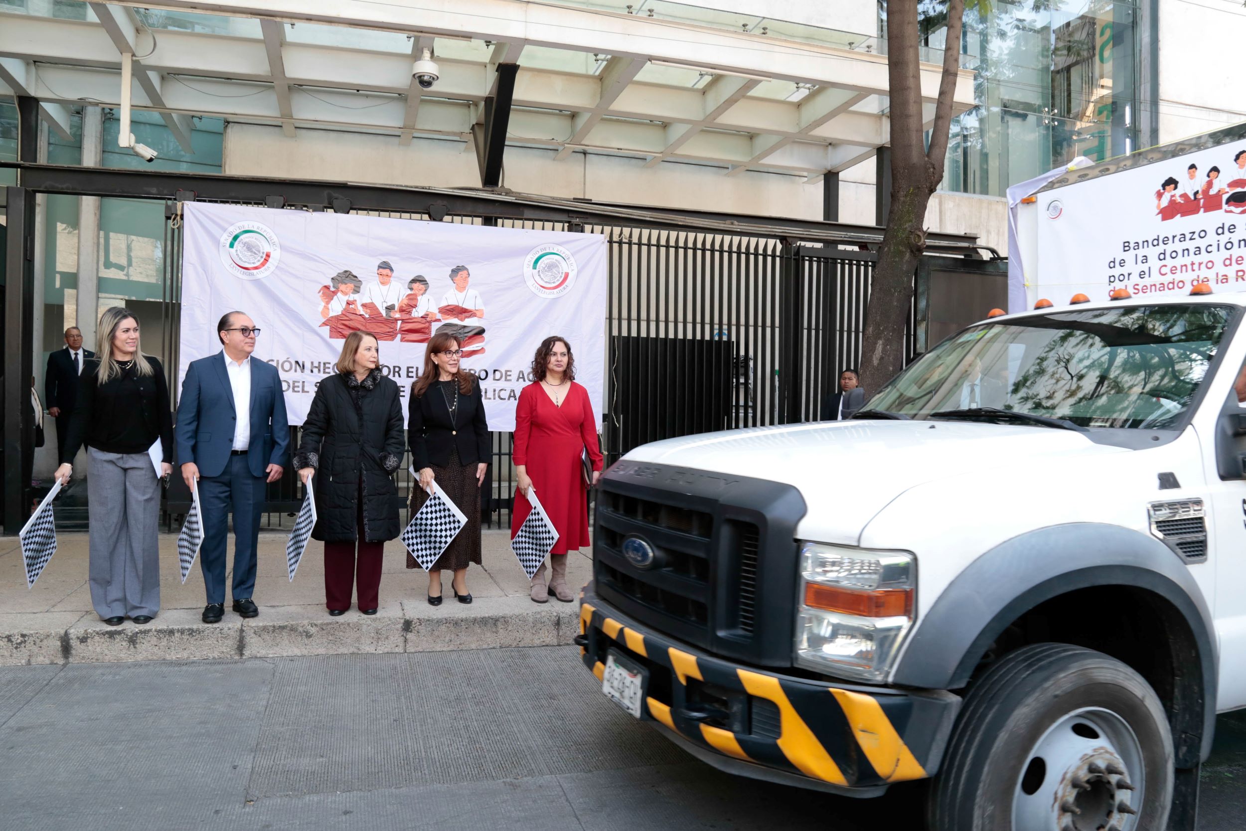 Ciudad de México, 31 de octubre de 2025.- La presidenta del Senado de la República, Laura Itzel Castillo Juárez, dio el banderazo de salida a ocho vehículos con 12.6 toneladas de víveres que donaron senadoras, senadores, trabajadores de la Cámara y ciudadanos en el Centro de Acopio que instaló la Cámara en la Plaza Luis Pasteur, para ayudar a las familias afectadas por las intensas lluvias.