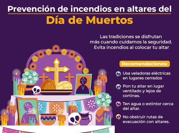 De acuerdo con la coordinadora auxiliar de Seguridad en el Trabajo del IMSS en Hidalgo, Luz María Lambros Sánchez, las celebraciones por Día de Muertos suelen involucrar velas, papel picado y otros materiales inflamables, por lo que se recomienda mantenerlos en lugares ventilados, alejados de cortinas, plásticos o telas que puedan arder con facilidad.