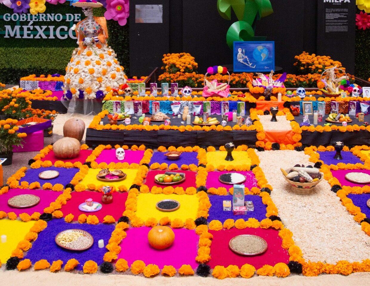 Además, no pueden faltar las calaveritas de azúcar, amaranto y chocolate, el pan de muerto de distintos tipos, comida deliciosa —como el mole con pollo adornado con semillas de ajonjolí— y como invitadas especiales: las distintas presentaciones de Leche del Bienestar.