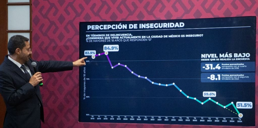 Sobre ese tema, el titular de la Secretaría de Seguridad Ciudadana (SSC), Pablo Vázquez Camacho, reiteró que la percepción de inseguridad ha acompañado el descenso en incidencia delictiva y en violencia en la ciudad. Puntualizó que en la ciudad, en 2018, nueve de cada 10 personas percibían insegura a la ciudad, y eso se redujo cerca de 40 puntos porcentuales, llegando a su punto más bajo hacia el tercer trimestre del año pasado.