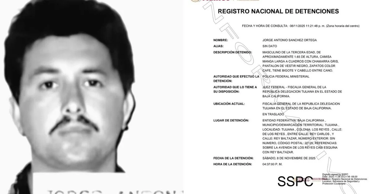 Según el Registro Nacional de Detenciones, Sánchez Ortega fue arrestado a las 16:37 horas del 8 de noviembre en la colonia Los Reyes, sobre la Avenida de los Reyes casi esquina con la calle Rey Baltazar. La detención estuvo a cargo de la Policía Federal Ministerial, y el detenido se encuentra actualmente en la Delegación de Tijuana de la Fiscalía General de la República, bajo la disposición de un juez federal.