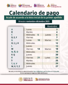 Ciudad de México, 10 de noviembre de 2025.- El gobierno de México, a través de la Secretaría de Bienestar, ha iniciado el bimestre de pagos para la Pensión para el Bienestar de las Personas Adultas Mayores referente a noviembre-diciembre de 2025, con el objetivo de llegar a más de 13 millones de beneficiarios a nivel nacional.